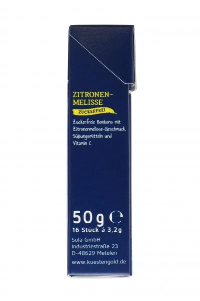 Zuckerfreie Bonbons mit Zitronenmelisse-Geschmack, Süßungsmitteln und Vitamin C.